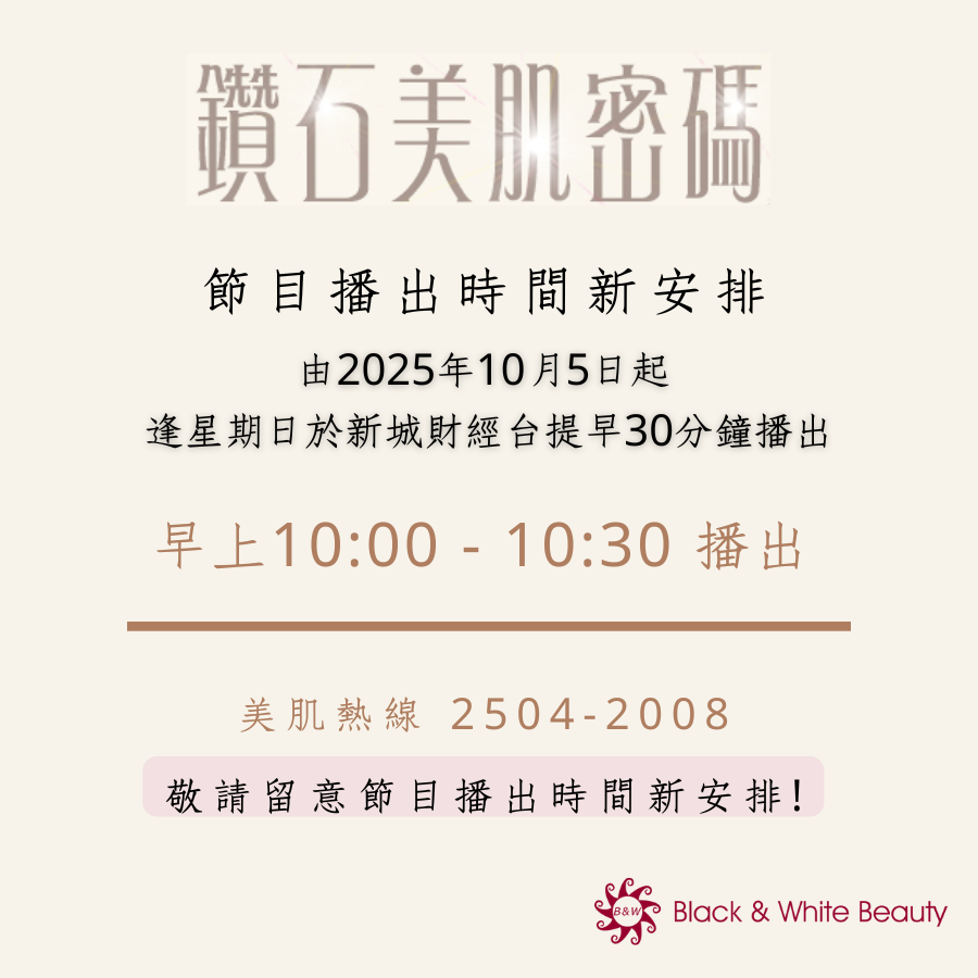 我們很高興地通知您,鑽石美肌密碼節目將提早30分鐘播出。