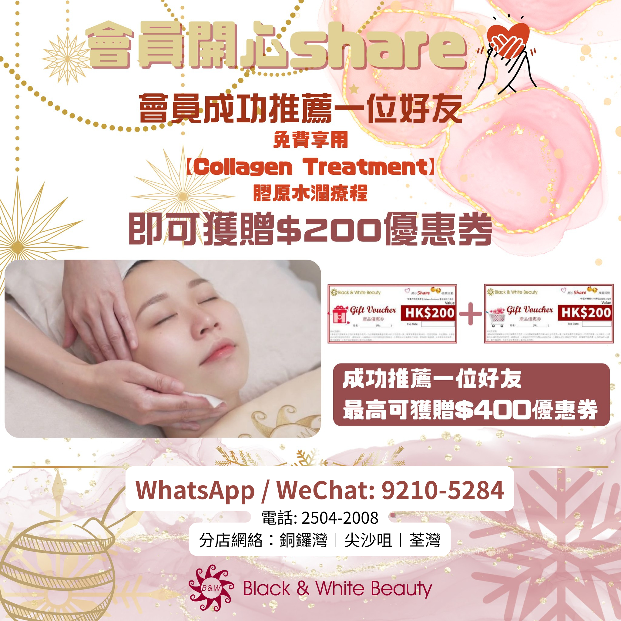 2. Black & White Beauty會員推薦一位好友成為全新客戶,登記及完成免費【Collagen Treatment】膠原水潤療程 (價值HK$588),即可獲贈一張價值$200的產品優惠券;